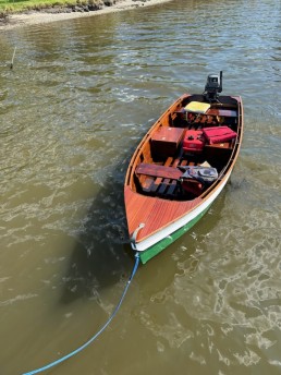 - Material: Mahogany frames, Douglas Fir Marine Plywood, Juniper seats and floor boards, white oak rails